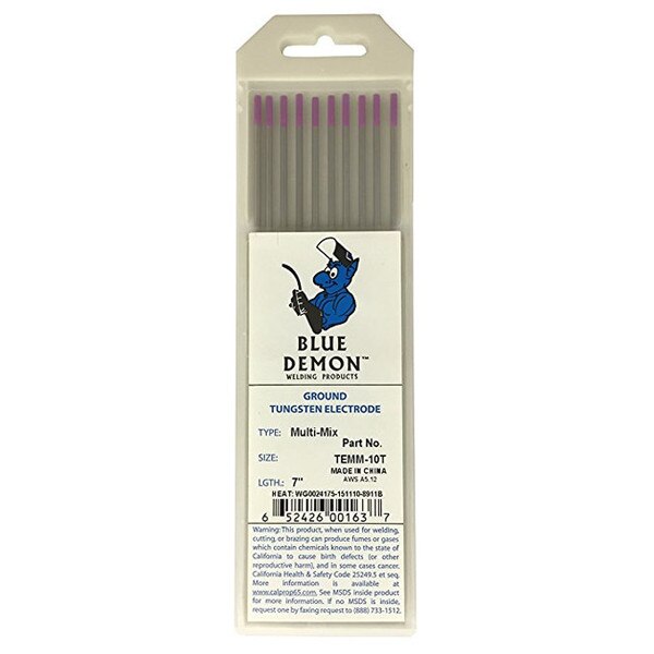 Blue Demon Multi-Mix is the new alternative to radioactive 2% throiated tungsten. This rare earth tungsten has been proven to dramatically increase weld quality and service life by offering unsurpassed stability and consistency in every weld. It is non-thoriated, non-radioactive, and non-carcinogenic. It is a proprietary product containing multiple additivies of rare earth oxides. Each additive complements others to enhance the welding performance. Being non-radioactive, it is a popluar replacement to thoriated tungsten. Multi-Mix tungsten electrodes can be used at all current ranges on both DC and AC TIG.